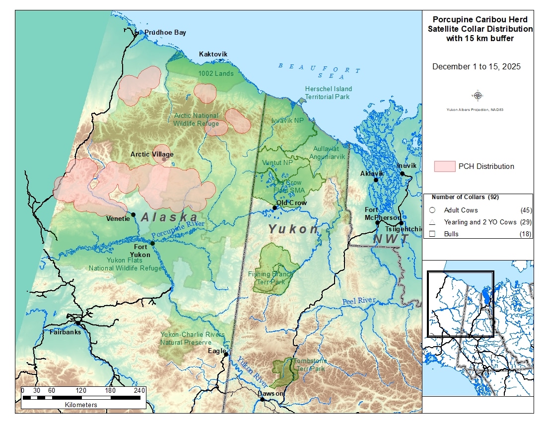 The map below is made available to the public as an educational tool and to assist community members to generally identify if Porcupine caribou are in their area. A 15-km buffer has been added to caribou locations in an attempt to strike a balance between the community requests for location information and conservation concerns related to potential increased harvesting pressure.